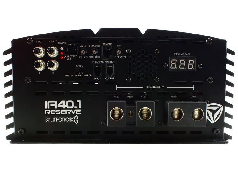 SplitForce divides the power supply section and the audio section into two halves and places them on top of each other in a vertical configuration, and uses link cables to attach the two sides together creating a working unit that can function like existing amplifiers, while both sides have their own PCB. The end result is an amplifier that is 50% smaller in length, while still maintaining the ability to strap or link amplifiers. The additional two inches in height allows space to add many extra features such as an onboard voltage display, remote indicator (REM-I) plug which allows you to monitor the status of your amplifier from another location such as the dash or podium of your vehicle, three extra cooling fans, segmented power and ground connections. This unit has all the features, function, and power you need on the streets or in the lanes.